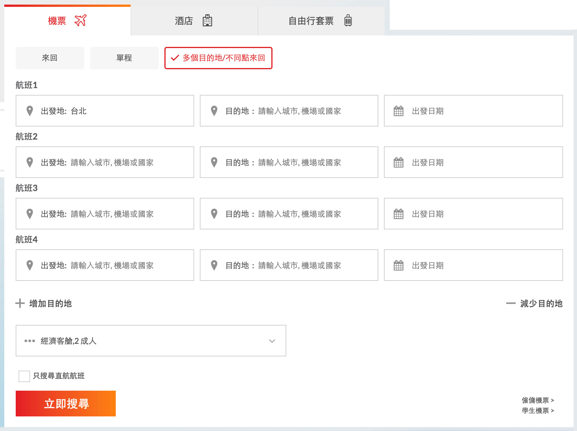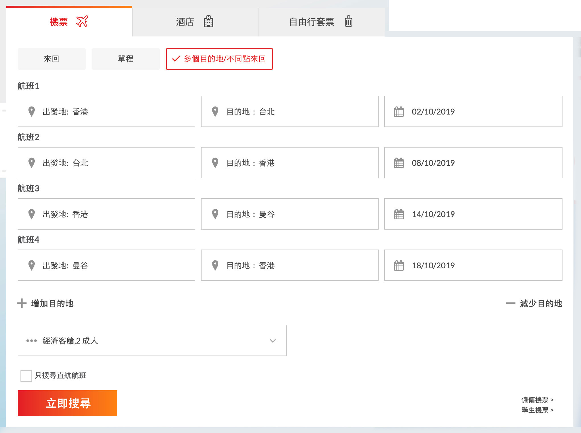 填好行程資料後, 選擇乘客數量和客艙等級, 然後按「立即搜尋」/「繼續」按鈕。