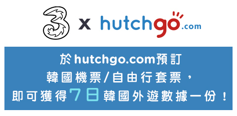 - ⚫於www.hutchgo.com.hk 或hutchgo.com應用程式預訂由香港來回韓國之機票或自由行套票,每個預訂可獲得3香港7日「RoamLite 日費計劃」乙份。