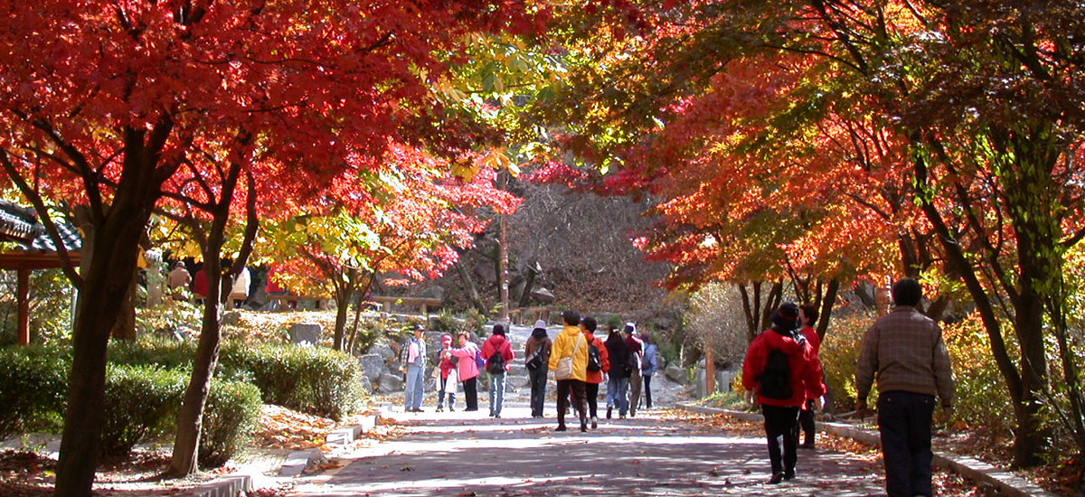 南漢山城是京畿道數一數二的楓葉名勝,其登山路和城郭都完好保存,而楓紅和行宮的搭配,非常具有古典美。城郭長達12公里的南漢山城共有5條登山路兼探訪路,努力攻頂到城內的最高峰「日長山」,可以看到京畿道一代的美麗景色,被選為秋天賞楓的特色路線。