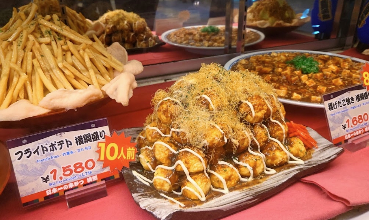 有去過通天閣附近的大家一定對「橫綱」不陌生,店鋪門口上方掛滿了超巨大的相撲手名牌和燈籠,而且門口還會展現出「巨大化食物」,這也是「橫綱」的招牌系列「横綱盛り」(MEGA盛)。以相撲手的食量打造比正常餐點再豐盛8-10倍的巨型料理,因此出現了堆積如山的章魚小丸子、十人都未必能吃完的巨大炒麵等,吸引了不少遊客去挑戰!不過大家無須擔心,「橫綱」也有提供正常分量的餐點,味道很不錯,而且店鋪是24小時營業,附近就是著名的通天閣和世界大溫泉,隨時隨地都可以來吃。小編悄悄提醒大家,只有這一間通天閣分店是24小時營業的,附近還有一間新世界本館晚上10點就會關門哦!