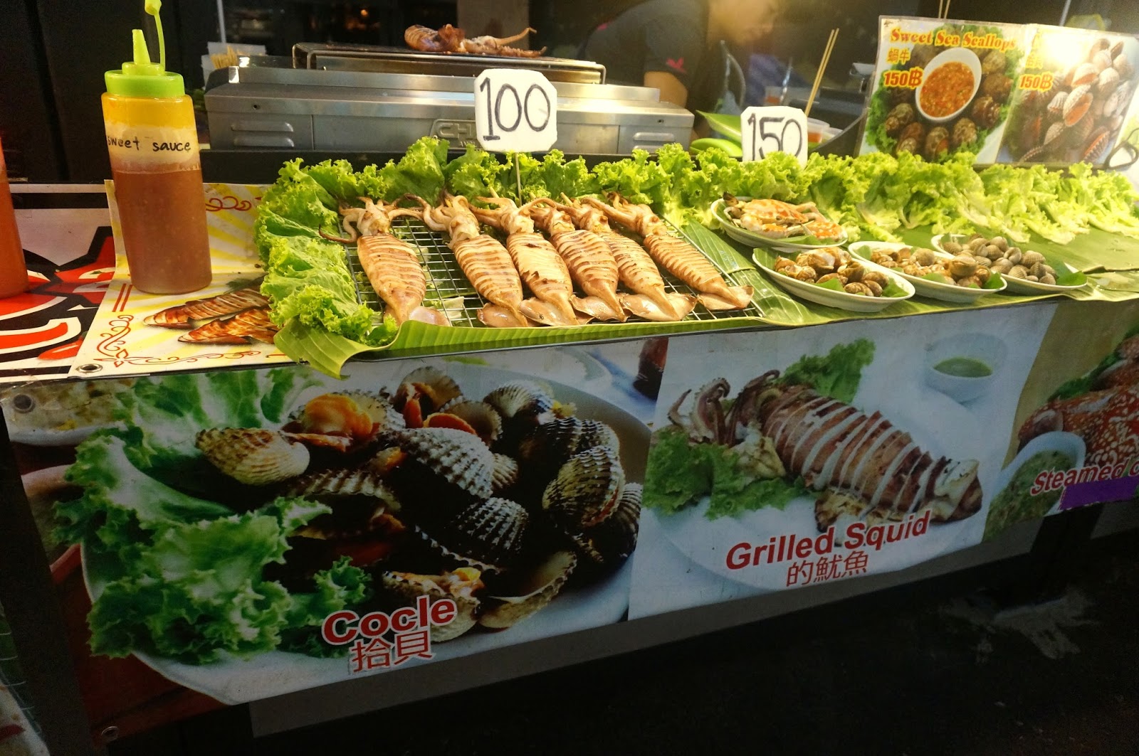 入內就是一檔檔的小食、燒烤,也有只賣飲品的。我們則向燒烤攤進發!其實大部分都已經煮熟了,不過他們會再放到爐上烤熱。魷魚只要100銖!