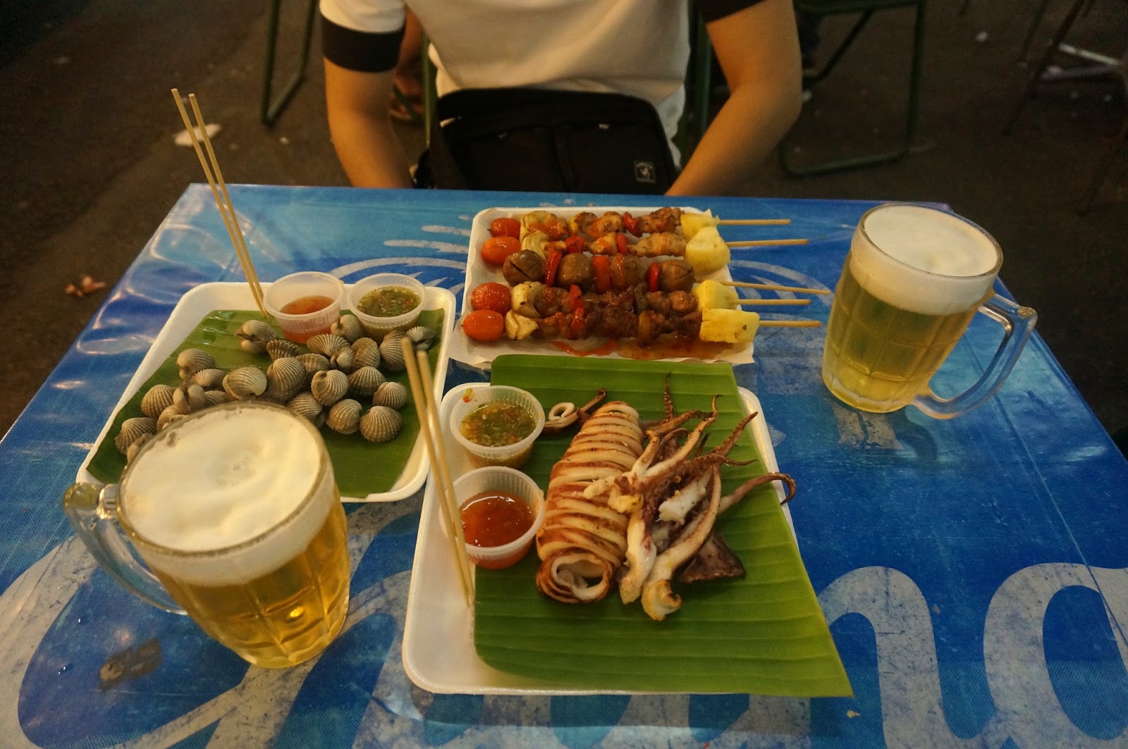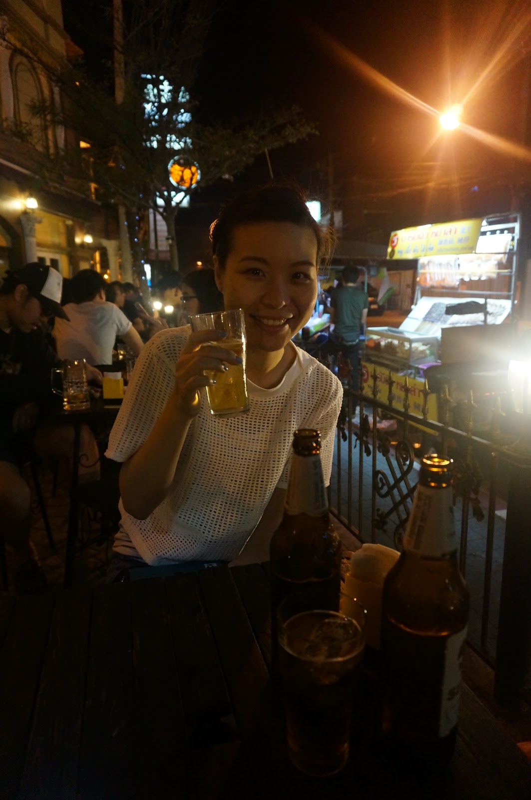 大頭跟我說既然是酒吧應該有東西食吧,bar food也可以啊,還可以喝兩瓶啤酒解解暑。找到了全店最後兩個位置坐下來,點了飲品後,才發現這裡的食物選擇少而且超貴!然後我看到隔壁的泰國人們全都在吃menu上沒有的,有烤大蝦有燒魷魚烤肉… 滿是問號之時我看到隔壁桌的女生在付錢給名面的車仔檔,我倆才後知後覺的發現,食物都是從外面一直傳來食物香氣的車仔檔買來的!怪不得在酒吧外一直停著三幾輛小食車。