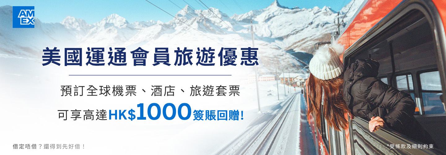 於推廣期內,經 hutchgo 旅遊平台以合資格之美國運通卡預訂機票、酒店、旅遊套票累積簽賬淨額滿HK$20,000,可獲HK$1,000簽賬回贈!名額有限,先到先得!
