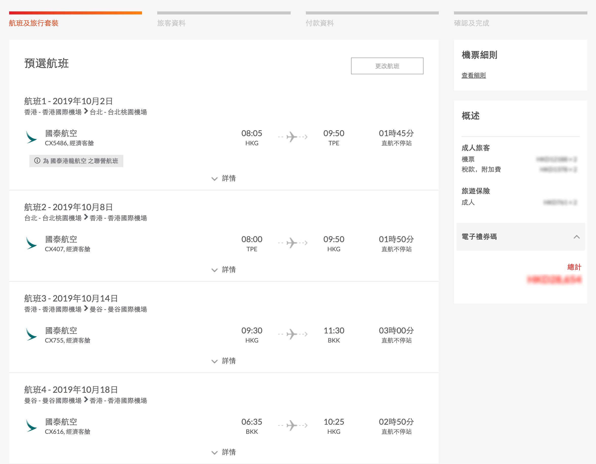 在搜索工具中,輸入4個航班嘅資料。例如:[航班1] 香港-台北;[航班2] 台北-香港;[航班3] 香港-曼谷;[航班4] 曼谷-香港